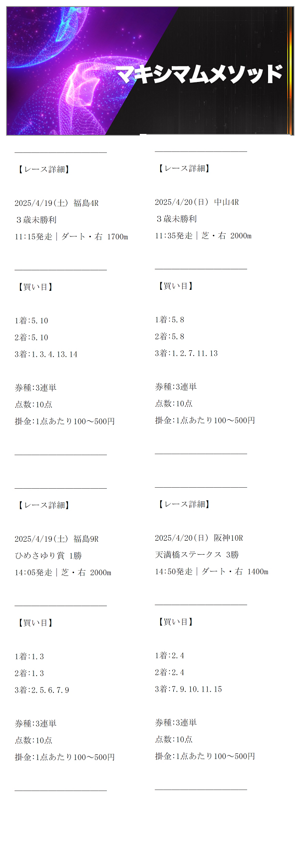 土日2日間で4鞍提供で情報料金10万円