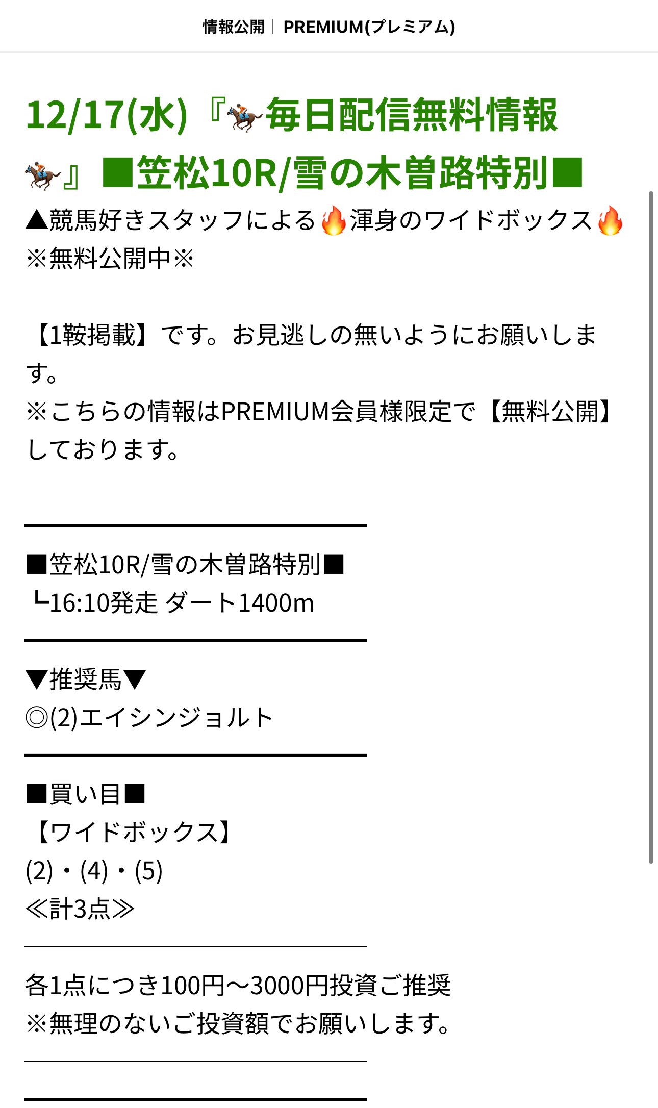 買い目点数3点って言うのがお小遣い制のわれらにとってとても救われる無料予想の形!